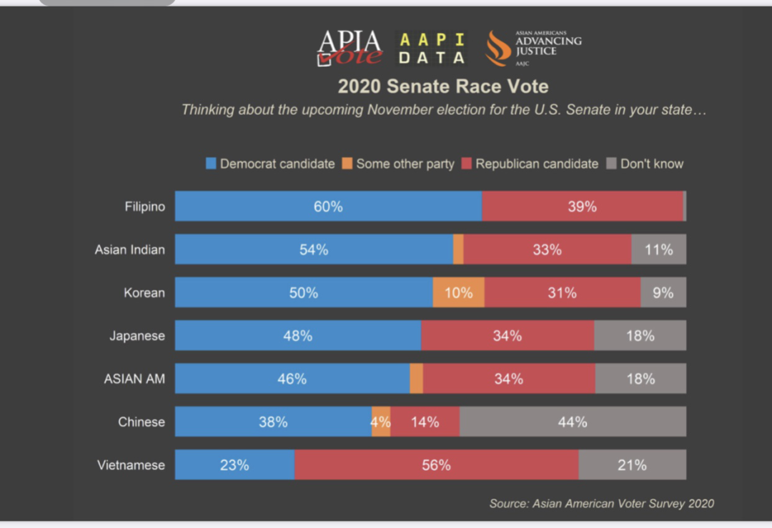再看2020年的参议员选举。有38%的华人支持民主党候选人,只有14%的人支持共和党候选人。说明美籍华人整体是偏向民主党的。另外,也有多达44%的华人不知该选谁,远远高于其他亚裔群体。这可能说明华人社会距离主流政治较远,政治参与度低。到了参议院选举已经不关心不了解了。