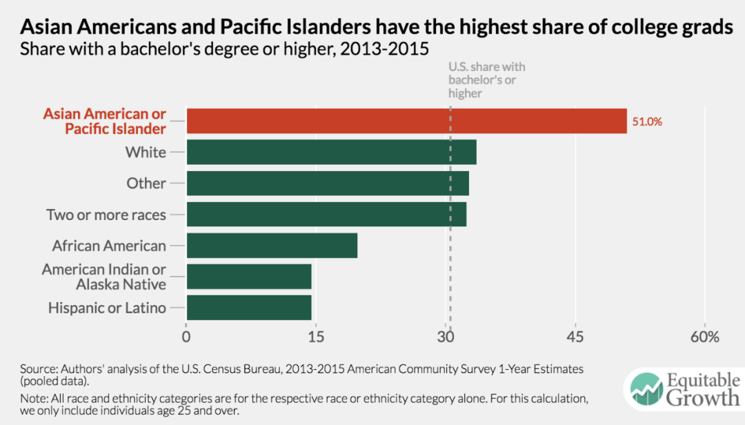 上图的统计说明,亚裔中有超过半数拥有学士学位,是各种族裔里比例最高的。