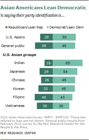 2012年的数据:华裔有49%偏向民主党,26%偏向共和党。