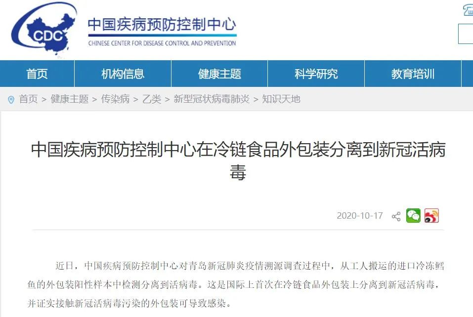 中国疾病预防控制中心在冷链食品外包装分离到新冠活病毒