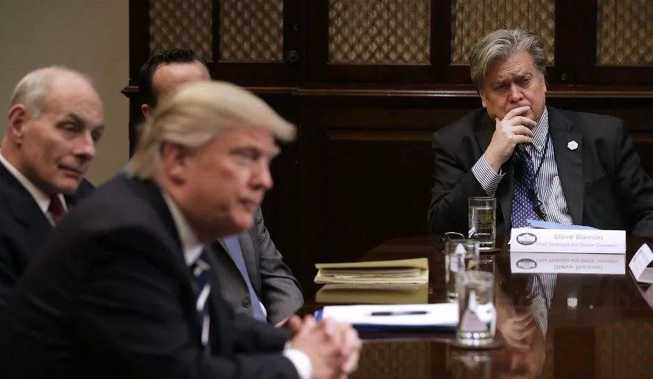 ▲史蒂夫·班农(右一)精英生产过剩就会产生“反精英”,反精英则在平民中寻找同盟。当平民的生活变得越来越糟,少数试图将自己拉上精英救生艇的人,被已经在船上的人推回水里的时候,社会就行将崩溃了。