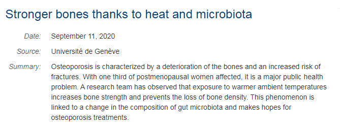研究者表示,肠道菌群在这一过程中发挥着作用。一旦细菌适应了较高的温度,它们合成和分解多胺分子的能力会受影响,这类分子会参与机体衰老过程,特别是在骨骼方面。研究数据显示,暴露在温暖环境中,可以作为一种预防骨质疏松的方法。