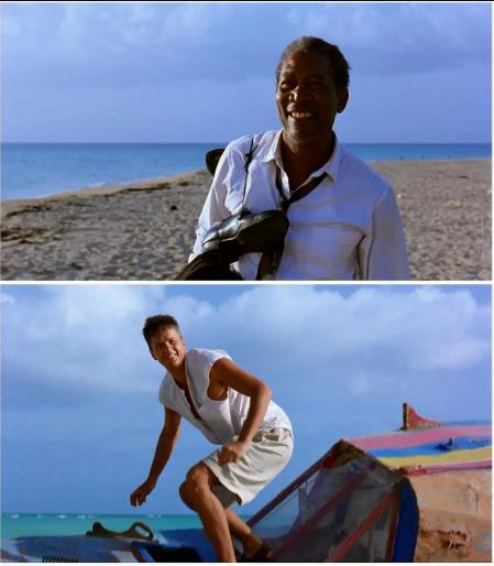 影片的最后,在瑞德就要放弃对外面自由世界向往时,他被假释了。但在监狱度过大半辈子的他,患上了和老布一样的症状——不能与与外面世界接轨。