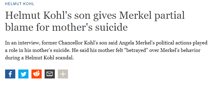 前总理科尔的儿子在接受采访时说,默克尔的政治行为对他母亲的自杀起了一定作用。他说,他母亲对默克尔在赫尔穆特·科尔丑闻中的行为感到“背叛”。