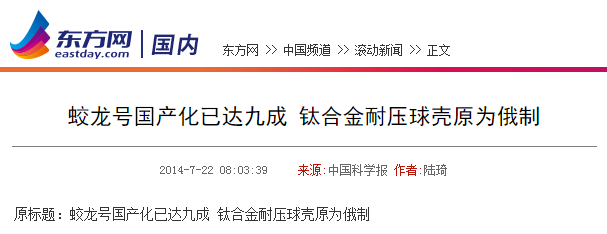 从今天键盘侠的眼光来看,“蛟龙”属于典型的“印度式”产品。日本的摩托,中国的铁棍,印度的人,连人种肤色都不一样,这就叫“印度式”产物。“蛟龙”号深潜器的外壳是中航工业洪都分公司的产品,但是里边的零件大部分都是从外国采购的。耐压钛合金壳体来自于俄罗斯,涡轮扇叶发动机来自美国,发电和配电系统来自法国,全身超过80%的零件依赖进口。