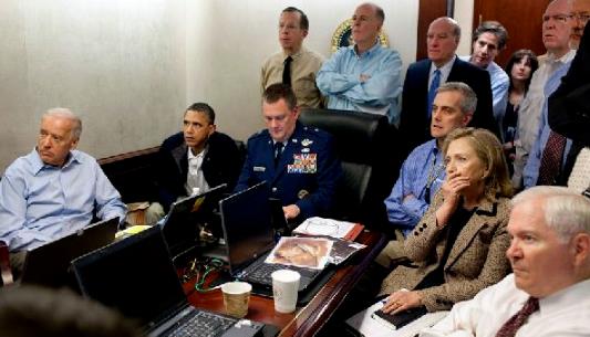 2011年5月1日,美国海豹突击队第六分队在巴基斯坦发现并击毙了制造“911”事件的元凶拉登,当时白宫的战情室里坐着奥巴马、拜登、希拉里,后排站着的人里就有布林肯。这一决定在布林肯看来,“从未见过一个领导人做出比这更勇敢的决定”。