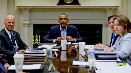 奥巴马政府时期,时任副总统的拜登(左一),总统奥巴马(中),布林肯(右二)