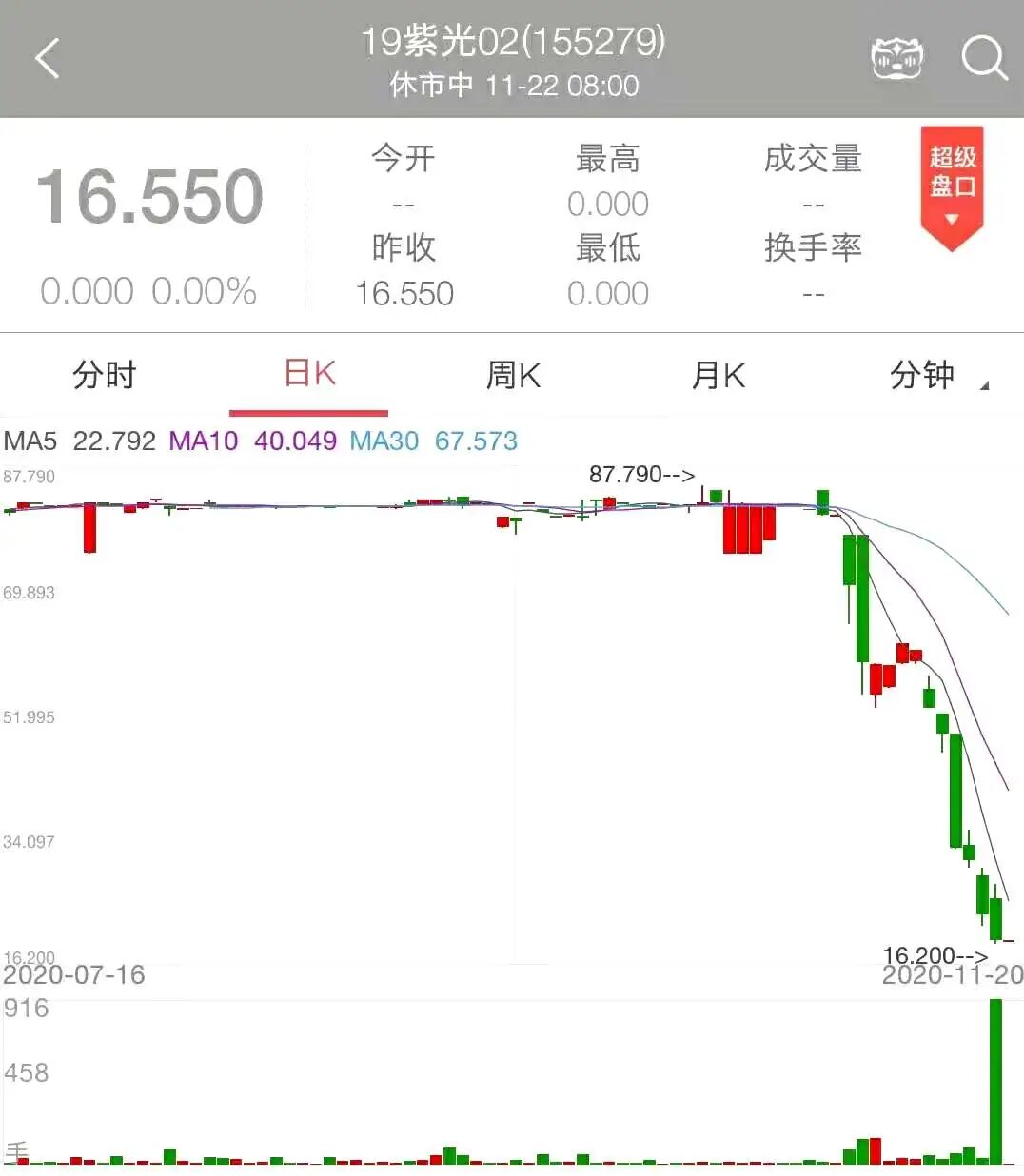 “19紫光02”在10月28日的收盘价还是83元,可截至11月13日其价格已跌至16.55元。也就是说,在两周的时间内、其价格下跌了80%!