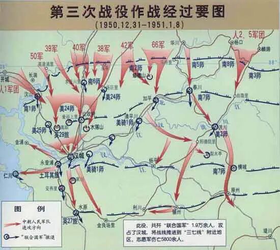 1950年12月31日,志愿军在结束第二次战役仅仅休整7天之后,就迅速发动了第三次战役,这次战役因为9兵团没有参战(因为在二次战役中损失太大伤了元气,不得不撤下来休整)所以总兵力锐减为30余万,相比正面的联军已经没有多大的兵力优势。