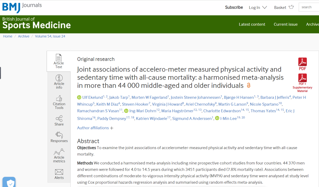在这些研究队列中,参与者久坐的平均时间为8.5~10.5小时/天;中到高强度体育活动从8分钟/天~35分钟/天不等。