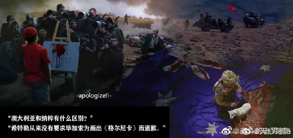 首先,是CG插画师@乌合麒麟 又画了一幅插画。插画中,西方媒体的镜头在莫里森的指挥下,都对准了正在画插画的“小孩”,而在西方媒体摄影师的背后,则是正在对平民屠杀的澳大利亚士兵。在莫里森的脚下,到处是无辜平民的尸体,莫里森则正用澳大利亚国旗掩盖尸体、掩盖真相······CG插画的下面就一个一语双关的单词:那既是莫里森嘴里的“道歉”,也是插画师表达的“谢罪”!!