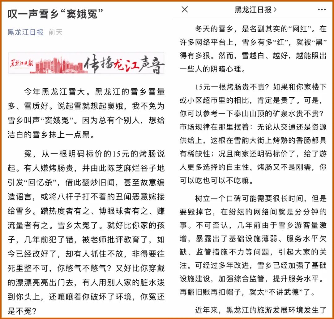 “不是刚需”以及“明码标价”的观点我是认同的,但问题在于这一句——“除了喊冤,必要时,还得让喷子切身体会一下什么叫‘互联网不是法外之地’”,评论员赤裸裸在报纸、网络上公开威胁游客,我认为不妥。而且,山东商报的记者同志们很不厚道啊,他们爬到泰山山顶一看,矿泉水5元一瓶,并且是人力挑上山的。记者还录了视频放到网上,这属于啪啪打对方的脸——你怼网友,不要扯我山东。话说回来,游客吐槽“烤肠15元一根”并没有犯罪,甚至也很难说有多大恶意,就是吐槽而已,这样的吐槽在网络上是最普通的。评论员估计一时激动,就把“互联网不是法外之地”的说法也带出来了。东北人这些年面对网络评论有情绪,我很理解。毕竟东北这些年发展速度一般,动不动就负增长,而且人口流失比较严重,比如三亚都成了黑龙江省三亚市,有点黑色幽默的意思。尤其是涉及雪乡这个屡屡上热搜的地方,曾经有负面,如今有改善,疫情过去,正好要大干快上,希望能够尽量挽回一些损失,偏偏有人居然“胆敢”公开吐槽……所以,评论员逮到一个机会想反击一下也很正常,就是有点过头。