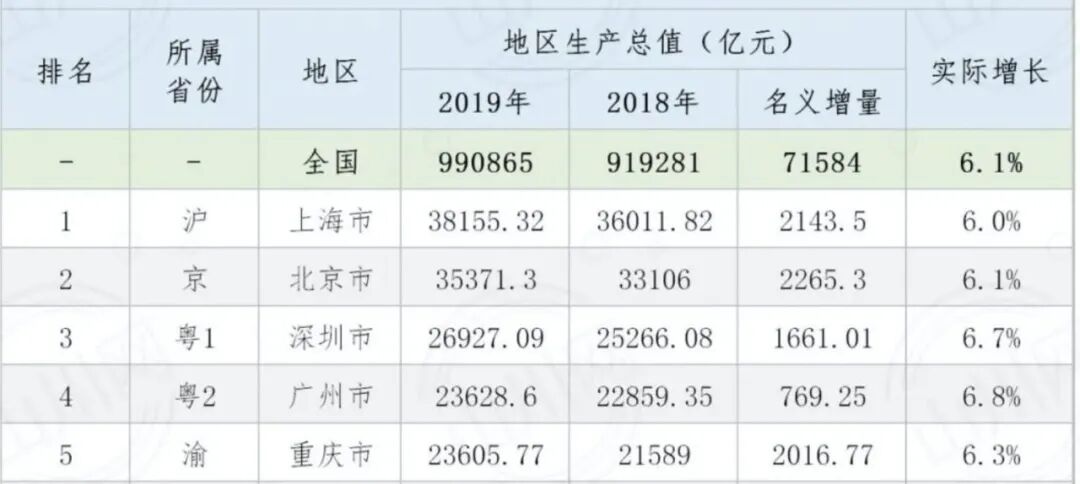 据统计,2019年末,达到2万亿GDP的城市共有5个,分别为:上海、北京、广州、深圳、重庆。