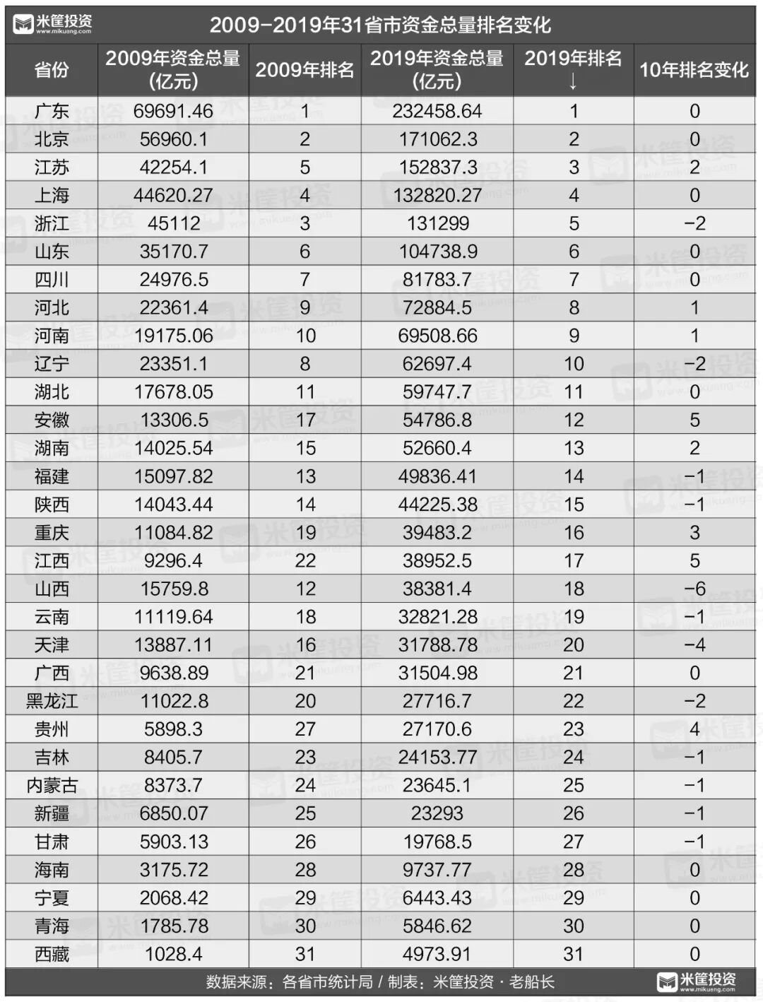 再来看一下10年间的资金总量增幅,谁又称了王?