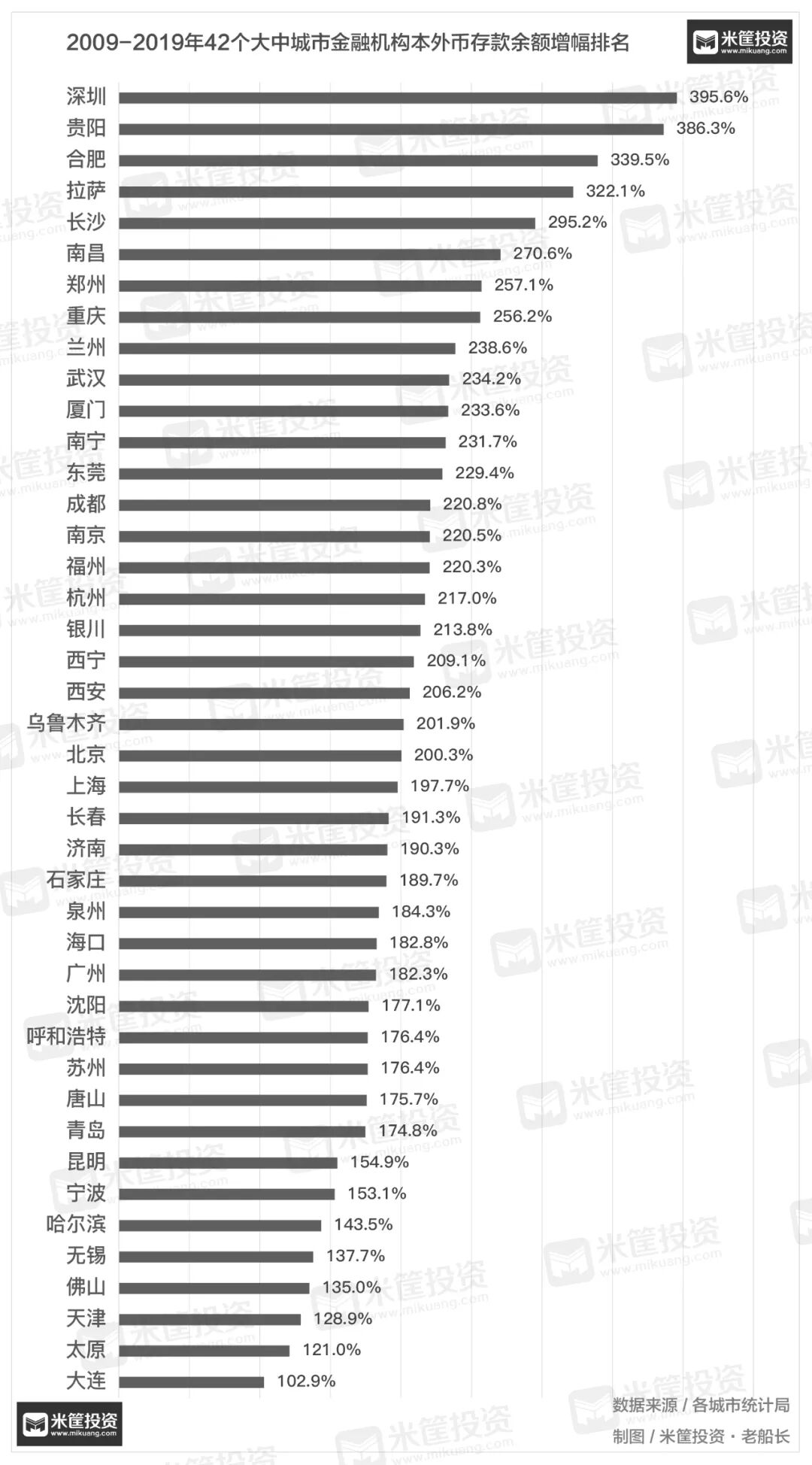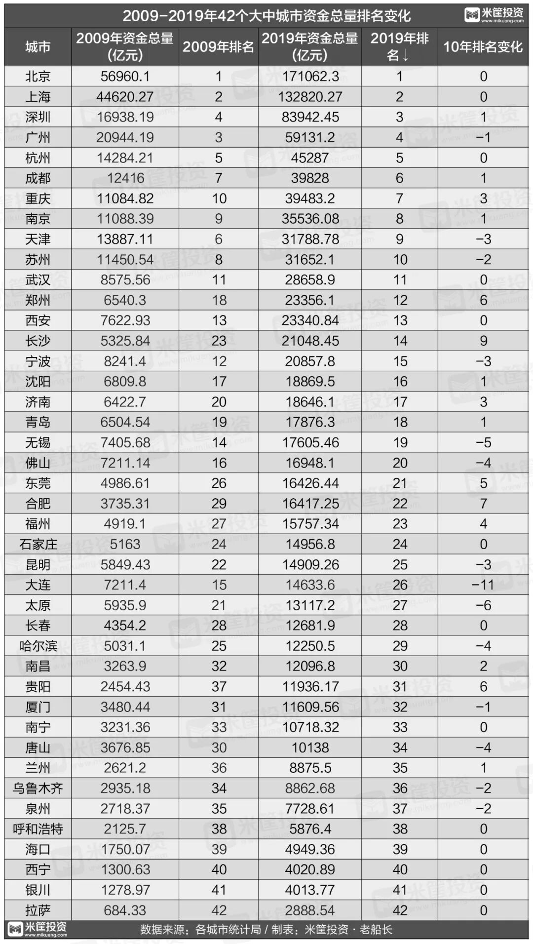 以10年资金总量的增长幅度来看,42个城市最低都实现了翻倍。
