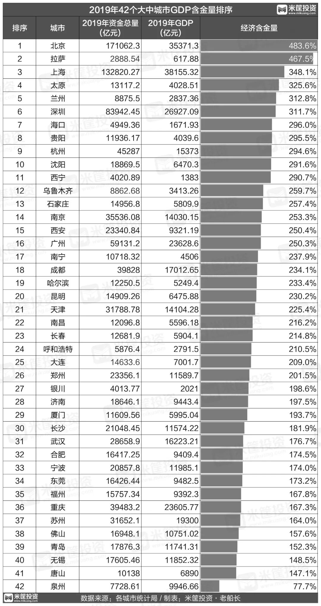 资金总量之外,学界还提出了“经济含金量”这一概念,即资金总量与GDP的比值,能看出哪些城市的经济含金量高低。