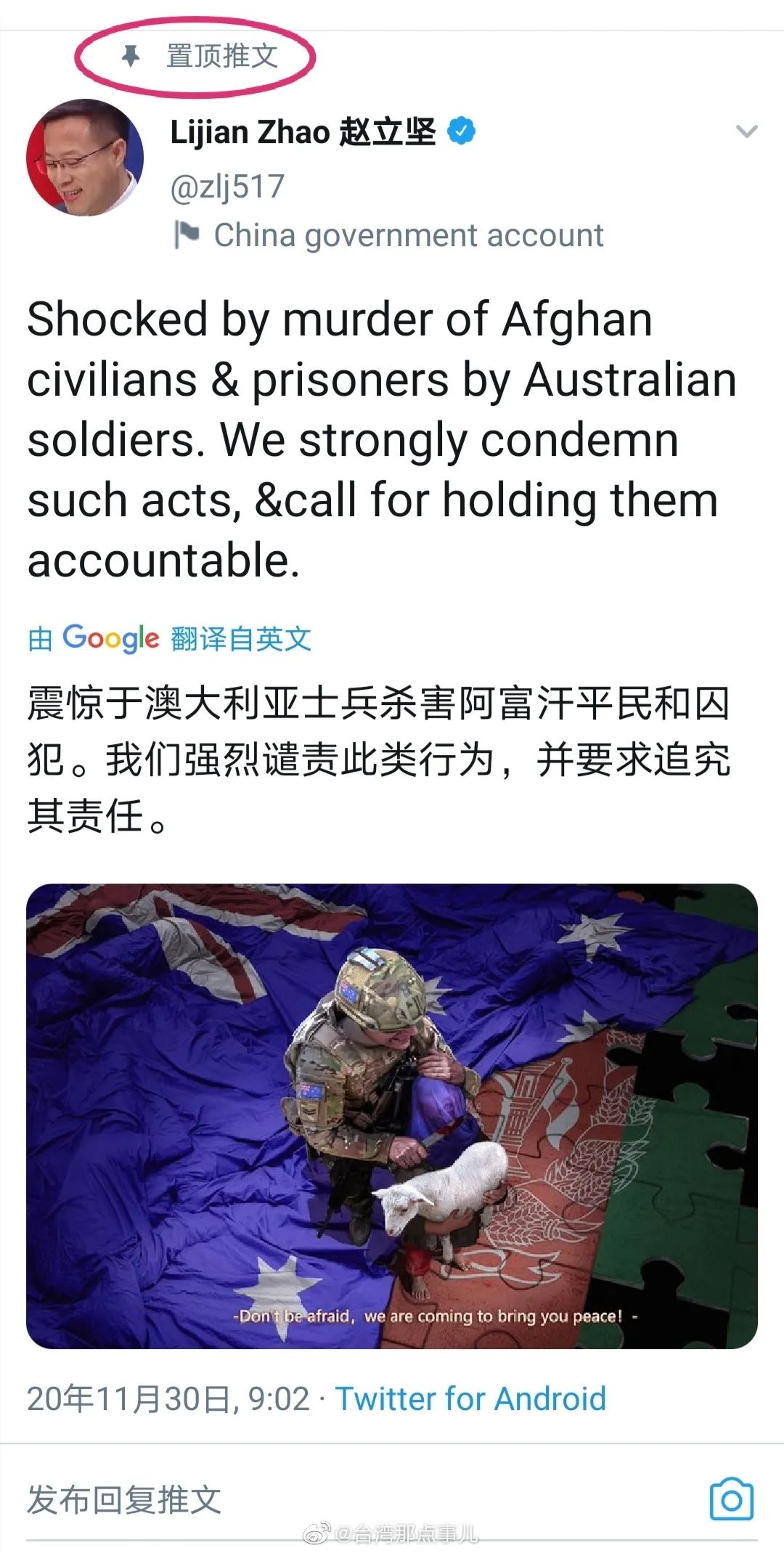 任何时候屠杀平民的行为都是应遭到谴责,这是真正的“普世价值”。11月30日,中国外交部发言人赵立坚在其推特账号上对此进行了强烈谴责并呼吁追究责任。赵立坚说:震惊于澳士兵杀害阿富汗平民和囚犯。我们强烈谴责此类行为,并要求追究其责任。