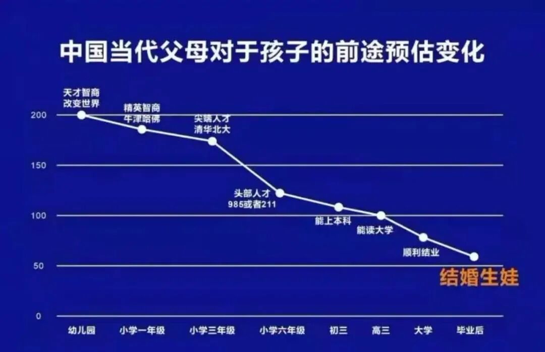 教育的这种“军备竞赛”模式,后果是什么?所有人都疲惫不堪。你的孩子10点睡,我的孩子11点睡,他的孩子12点睡。你上两个补习班,他上四个补习班。前一段时间我在一个妈妈群里,看到一个转发的新闻,讲的是一位文科出身妈妈,为了辅导孩子考大学,硬是把自己锻造成一个理工科的学霸。确实,东亚教育内卷严重,80年代大学生是天之骄子,现在大学生比民工还廉价。不是有个段子吗?4000块你到哪去请民工?你只能招到大学生。另外一个段子更加黑色幽默,为什么要买学区房?因为想上清华北大,清北毕业能买得起北京的学区房吗?您想多了。