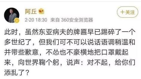 如果说,阿丘只是认为中国人应该道歉,那么,真的有人这么做了。2月份,美国宾夕法尼亚州立大学的一位中国留学生“Wending Mai”给全校群发了一份道歉邮件。“作为一个中国人,我感到非常遗憾,源于中国的冠状病毒疫情现在变成了给大家诸多不便的大流行病,甚至带走了许多人的性命。除了病毒的丑陋行为以外,中国政府的掩盖和世界卫生组织的拖沓也是诸多令人失望的造成病毒扩散的原因。美国是一个伟大的国家,我相信美国能够扛过去,并继续发展。我希望所有事情都会很快好起来。”