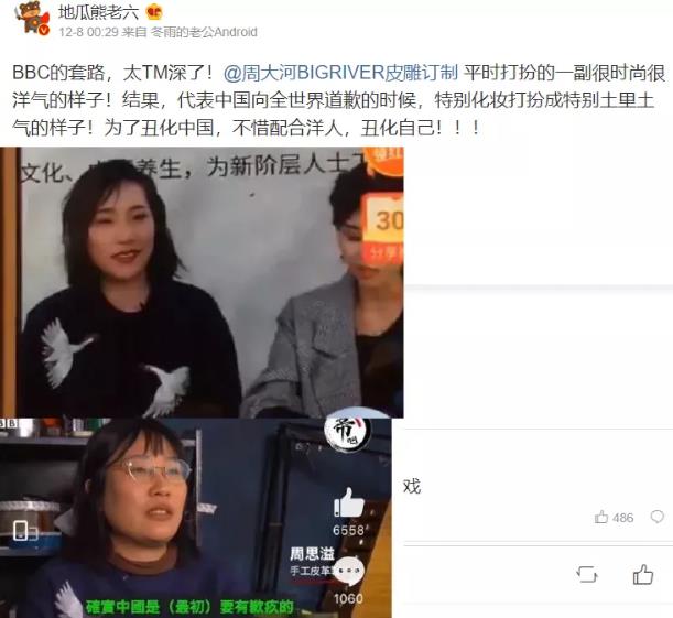都说疫情是一面照妖镜,各种妖魔鬼怪都在这照妖镜前显现了原形。确实,这一次蔓延全球的疫情,让全体国人看清了很多东西,看清了国外媒体肆意诋毁中国的丑恶嘴脸,也看清了个别中国人的无耻和卑劣。12月7日,BBC中文频道报道了题为《新冠疫情一年后,中国普通民众对未来的希望与担忧》的新闻故事。他们采访报道了一位中国90后女性,她叫做周思溢(周大河)。面对着外媒的镜头,周思溢侃侃而谈:“确实中国要有歉疚的,作为我们这些普通人,我们绝对是有歉意的。”这个女人是从哪里冒出来的?她有什么资格代表中国人向外国道歉?周思溢本名叫周大河,是个皮雕手工艺人,12月1日刚刚被官方当正面人物宣传过。周思溢和BBC的记者是如何联系上,确定话题,安排话术的?这背后有没有什么利益交换?我们知道的是,周思溢在接受BBC的采访中,向全世界公然宣布:对新冠病毒在全世界的爆发,我们中国人是有愧疚的。在外国观众的眼中,她似乎理所当然地代表了14亿普通中国人。她在代表14亿中国人向全世界道歉:“感到抱歉,犯了错误。”BBC在这里还别有用心地加了一句:“感到抱歉,犯了错误——在这里,从与党有联系的人口中听到这样的话是很不寻常的”。她做出这个道歉,有自己的理由,她说“中国也有帮助世界各地的国家,提供各种各样力所能及的帮助,这就是在弥补自己的过失。”这种可笑的逻辑,将她自己的个人判断,当成事实讲述给BBC 。周思溢一言既出,马上引爆网络,被中国网友谴责批评。可是周思溢不但不道歉,反而避重就轻地解释,是BBC对采访视频进行了恶意剪辑。自己的微博账号找不到了,所以不能解释事情原委。在英国议员刚刚嚷嚷通过炮舰外交让中国为疫情负责这个节骨眼,去接受BBC的采访,不觉得有不妥吗?这都2020年了, BBC是什么性质的媒体,为谁说话?心里没点数吗?BBC刚刚给乱港分子周庭和国内某著名日记作家颁奖,不知道吗?就算是真的被恶意剪辑了,不是你的原意,那能否解释一下,本来长相尚可、平时衣着精致的你,为何故意扮丑,打扮得符合西方白人对亚洲女人的刻板形象出镜呢?为何本来在上海精装修工作室工作的你,在展示志愿者证明书时,却故意跑到落后的农村面前拍摄呢?到底是BBC安排,还是自己主动有意为之,想博得BBC好感,向西方纳个投名状的呢?周思溢对中国社会、对中国形象、对中国抗疫、对中国在全球抗疫中的英雄作用的伤害已经造成,不是简单的一句“被BBC恶意剪辑”,就可以交代过去的。既然周思溢爱道歉,为什么如今装聋作哑,不站出来向被伤害的中国人道个歉呢?2020年2月20日,主持人阿丘在微博上说,咱们中国人要不怂也不豪横地把口罩戴起来,并向世界鞠个躬说:“对不起,给你们添乱了”!