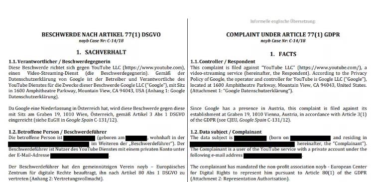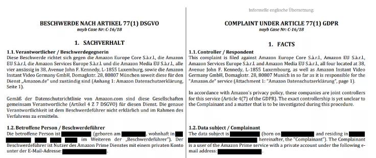 ▲图为NOYB组织递交的亚马逊和Youtube两家公司的投诉书