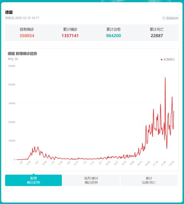 进入11月后,德国几乎每天新增确诊病例数量均突破1万例,甚至多次单日新增超2万,这使得德国累计确诊已于当地时间11月27日达到100万例。这个势头,和美国疫情中期的时候已经没有什么太大区别了。经济部长彼得·阿尔特迈尔周一在接受德国电台采访时表示,新的限制措施“反映了疫情已经失控的事实”。“如果这种情况继续下去,几周后医院就会人满为患。”
