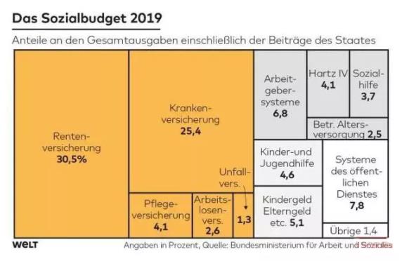 连一向稳健的德国,在社会预算中,最大的项目也是养老保险(占比超过30%),支付的压力非常大。