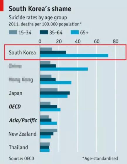 数据显示,2017年韩国有7391个老人自杀,这样高的自杀人数,连《经济学人》杂志都指责是“韩国的耻辱”。