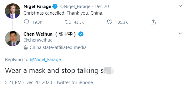 更让人觉得可恶的是,哪怕到了现在,一些英国政客依然在埋怨中国。英国“脱欧党”领袖奈杰尔·法拉奇在推特上发出了一句“无能的挖苦”:“圣诞取消了。谢谢你,中国。”并将该推文置顶。都到现在了,还想向中国甩锅,这就是西方的政客。对于这种污蔑,中国日报欧盟分社社长陈卫华当即在下方严正回复称,“戴上口罩,别再胡说八道。”