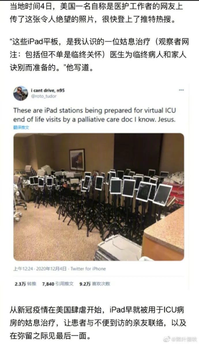 事实上,武汉疫情期间某作家造谣的火葬场一地手机是假的,但在美国一地用来给病人与家人做“临终告别”的iPad却是真的,美国一名护士在社交媒体上晒出来了一地iPad的照片。