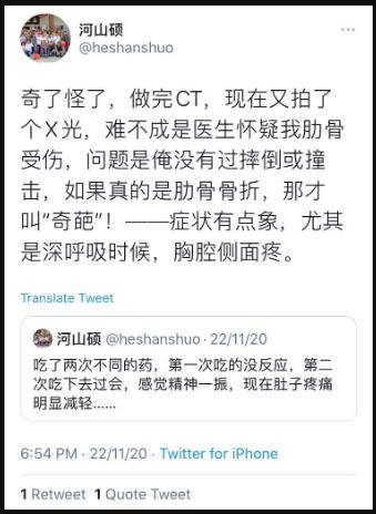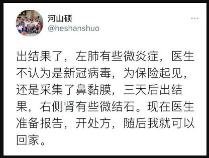 然后他又发帖称:出结果了,左肺有些微炎症,医生不认为是新冠,为保险起见采集了鼻粘膜,三天后出结果······现在医生准备报告,开处方,随后我就可以回家。