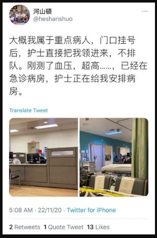 美国不但疫情控制不住,医疗系统实际上是完全放弃“应治尽治”的状态。根据“河山硕”的说法,11月22日他接受了鼻粘膜检测,3天出结果,他应该早就知道结果了,但医院显然隐瞒了相关信息,告诉他是普通肺炎,这客观上耽误了治疗。如果医院当时没有确诊,既然是高度疑似,那也应该再做进一步检测,然而医院的处理是让别人回去随便发展。直到12月8日,“河山硕”的病情明显很严重了,有了一系列咳嗽、发热等症状,他才又到洛杉矶的一家医院就诊。