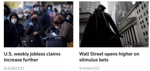 左:美国失业申请人数上升 ,右:股市在刺激计划下大涨