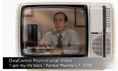 当时,普渡甚至专门制作了一个讲述6个饱受长期疼痛折磨的病患使用了奥施康定而重获新生的视频(却淡化了阿片类药物的副作用),名为“我夺回了我的人生!”(I Got My Life Back),拷贝量超过15000份,在宣传中,普渡制药鼓吹奥施康定的成瘾性不到1%。