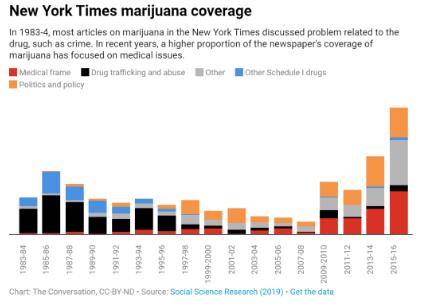 上世纪末,纽约时报与大麻相关的报道都与毒品(黑色)有关而在2009年后,则慢慢转向其“医疗用途”(红色)
