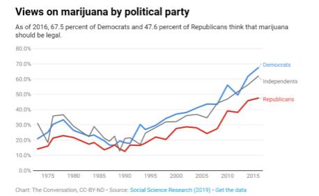 就连曾经坚定禁毒的共和党立场也在软化。1975年,共和党支持大麻合法化的人不到20%,2016年已达47.6%,转变的原因,与他们在移民问题上的态度软化非常类似。
