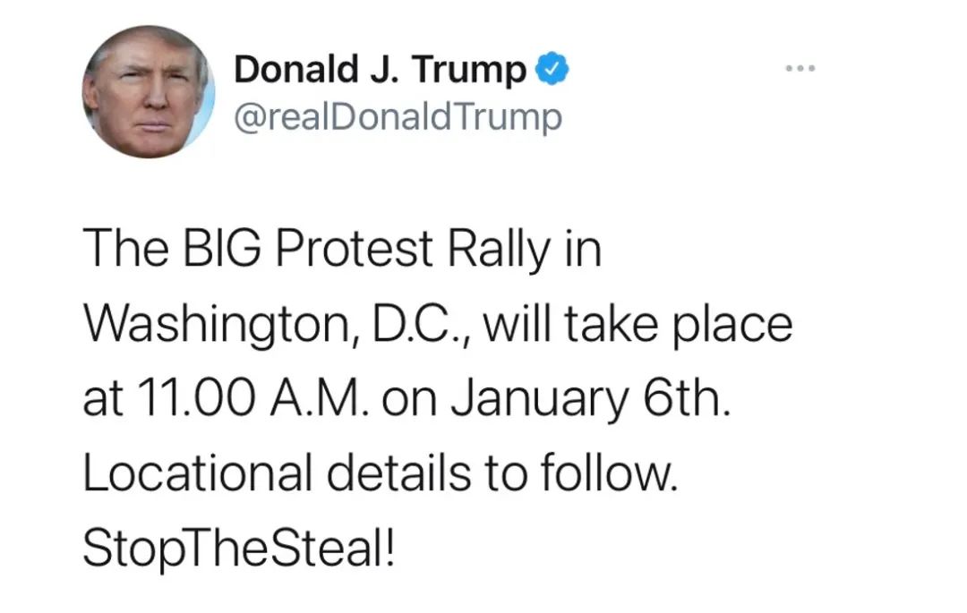 据环球网报道,美国总统特朗普当地时间1月1日发推预告称,1月6日上午华盛顿将举行“大型抗议集会”。他在推特中说:“1月6日上午11时将在华盛顿特区举行大型抗议集会。后续会通知具体位置。停止偷窃(选举成果)!”
