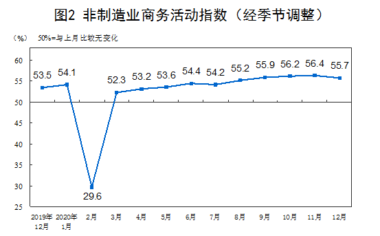 我们再从2020年12月份中国非制造业采购经理指数运行情况就能看出来我国商业的复苏情况。下图是过去一年非制造业商务活动指数,从3月份开始快速复苏后,整体一致处于上升状态,这也表明我国商业复苏得非常强劲。