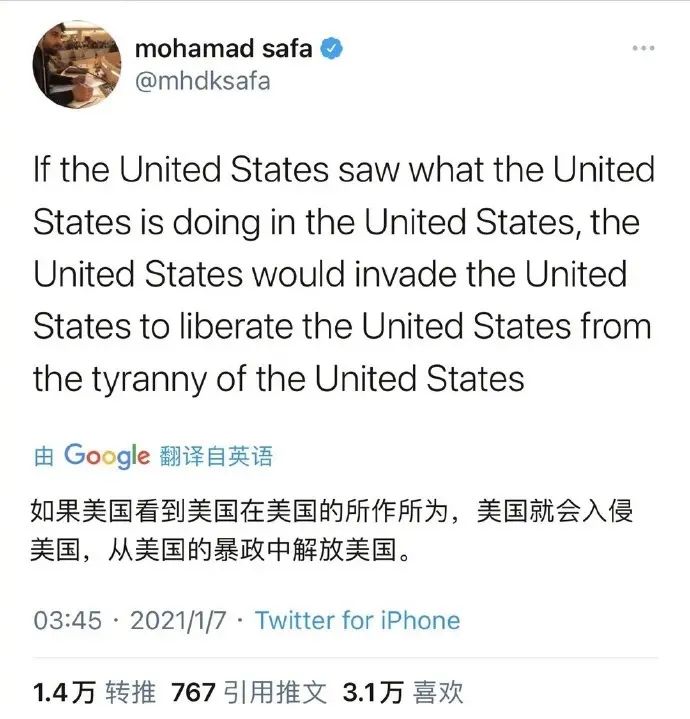针对美国的暴乱,黎巴嫩外交官、常驻联合国大使发文称:如果美国看到美国正在对美国做的事,美国肯定会入侵美国,并从美国暴政的手中解放美国 。