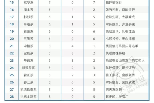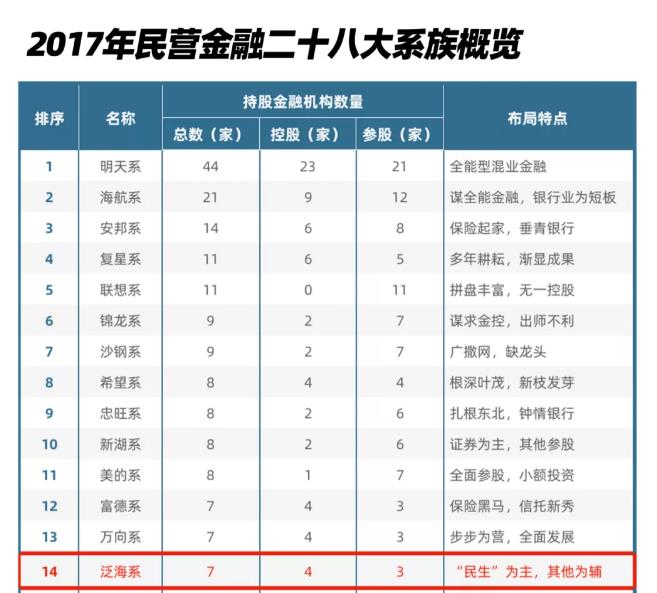 17年初,新财富还专门做了个统计。在查阅了一些民营集团入股金融机构的数量和大致情况后,他们理出来了一个“民营金融系族表”,基本上囊括了所有叫得上名号的“草莽”们。