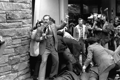 希尔顿酒店外,约翰·欣克利掏出了藏在棕褐色雨衣下的左轮手枪,对着几米外被人群簇拥着的里根,扣下了扳机。