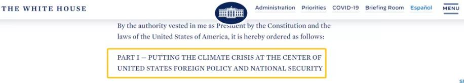 行政令第一部分的标题非常显眼:要把应对气候危机置于美国外交政策和国家安全的中心位置。