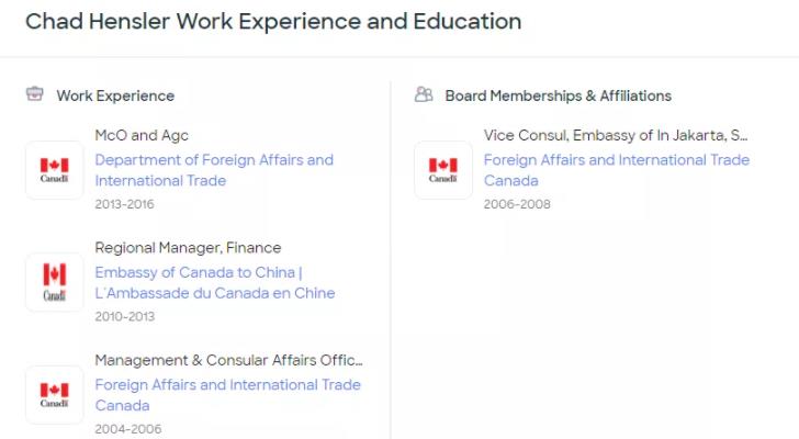 根据Zoominfo上的公开信息,韩思乐曾在2004-2006、2013-2016年任职于加拿大全球事务部,2006-2008年他还曾在加驻印度使馆工作过,主要负责的就是贸易行政部分。