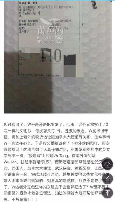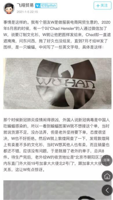 今年年初,有中国网友在网上爆料,述说了自己店主朋友“W”的经历。去年5月,一个名叫“Chad Hensler”的人通过微信找到“W”订购一套文化衫,但却遮遮掩掩拖了好久也没给发,直到7月才发送了图样,W发现是一只蝙蝠和“Wu-Han”字样。
