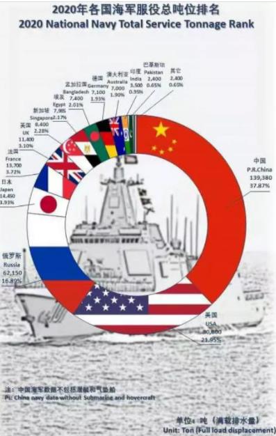 2020年,中国服役了32艘军舰,世界其他国家一共服役了41艘。当然,中国海军舰艇总吨位还不足200万吨,与美国的近400万吨还有至少一半的差距,我们还需要努力!
