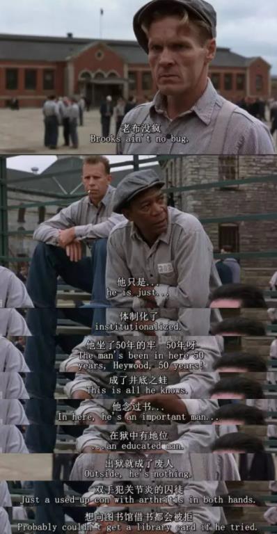 “监狱的这些墙很有趣。刚入狱的时候,你痛恨周围的高墙;慢慢地,你习惯了生活在其中;最终你会发现自己不得不依靠它而生存。这就叫体制化。”