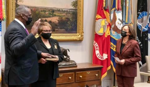 得益于奥斯汀41年在军中积累的威望,得益于拜登对他的青睐,以及他在面试环节的优秀表现,奥斯汀顺利通过了国会表决被豁免。2021年1月25日,美国第1位黑人国防部长劳埃德·奥斯汀站在美国第1位黑人女副总统哈里斯面前宣誓就职。