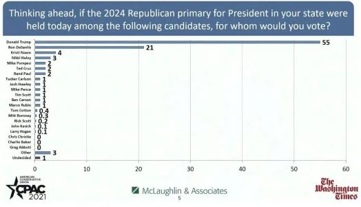 如果说上述数据因为样本问题还存在一些偏差的话,那么一年一度的保守派政治行动大会CPAC上2024年候选人的投票支持率恐怕就更加具有参考性了。在所有的候选人中,特朗普以55%高居榜首,比第二名候选人高34个百分点。