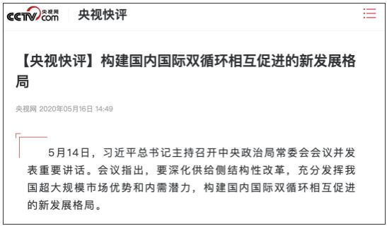 中央政治局常委会议上的表述为: 构建国内国际双循环相互促进的新发展格局。