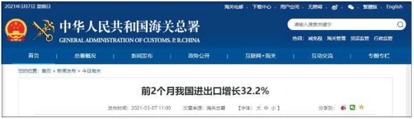 海关总署刚刚公布了2021年前两个月的的进出口数据。